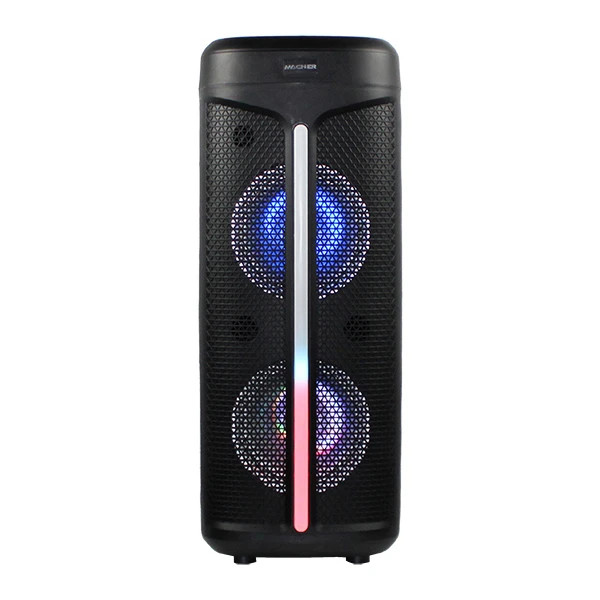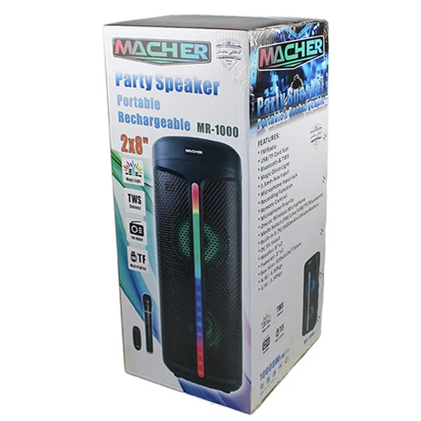 اسپیکرهای پارتی باکس مناسب برای پخش موسیقی در مجالس و فضاهای نسبتا بزرگ می باشد.اسیکر پارتی باکس MR-1000 مچر به راحتی قابل حمل می باشد.اسپیکر پارتی باکس یا چمدانی MR-1000 دارای ورودی جک 3.5 میلیمتری صدا می باشد و به کمک بلوتوث قابلیت اتصال به گوشی ، لپ تاپ و کامپیوتر را دارد.این اسپیکر داردی دو عدد ساب ووفر است و از FM Radio, TF CARD, USB. TWS, BLUETOOTH, AUX پشیتبانی می کند.یک باتری لیتیوم با ظرفیت 3600 می آمپر شدت جریان انرژی مورد نیاز این محصول را تامین می کند.رقص نور، میکروفون بی سیم و یک کنترل از راه درو از دیگر مشخصه های این اسپیکر از محصولات برند مچر میباشد.